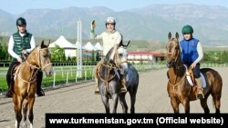 «Президент Гурбангулы Бердымухамедов обменялся мнениями о развитии массового физкультурно-оздоровительного движения и спорта высших достижений со своим сыном Сердаром, оседлавшим скакуна Мирас», - сообщило государственное информационное агентство ТДХ.