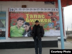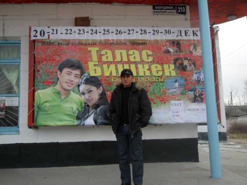 Арнусбек Бегалиев, молодой кыргызский кинорежиссер, у афишы своего дебютного фильма "Талас-Бишкек". Кыргызстан. 23.1.2011.